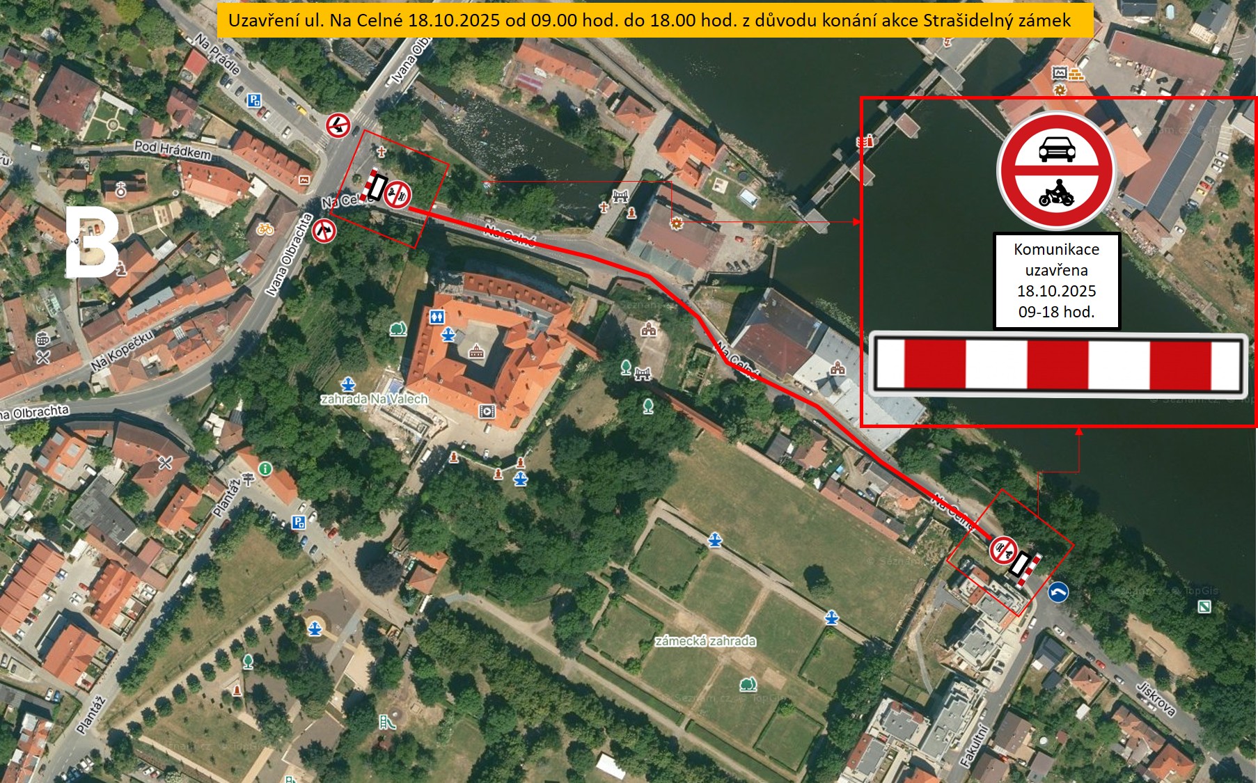 Z důvodu konání kulturní akce „Strašidelný zámek“, bude dne 18.10.2025 v době od 09:00-18:00 hod. uzavřen úsek ulice Na Celné. Uzavřený úseku bude od křižovatky s ul. I. Olbrachta, po křižovatku ul. Na Celné a Fakultní – viz grafika v příloze.