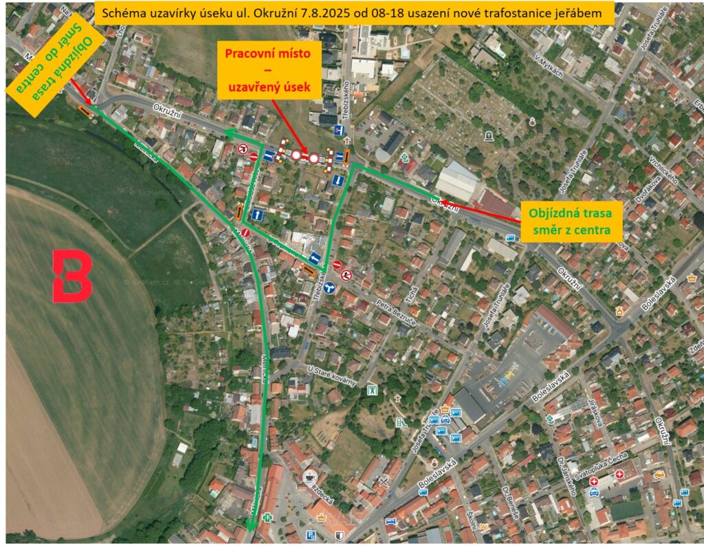 Z důvodu nutnosti provedení prací při usazování nové trafostanice za použití jeřábu, bude dne 7.8.2025 od 8:00 do 18:00 omezen provoz v úseku ul. Okružní. Omezený úsek bude mezi křižovatkami s ul. Mikoláše Alše a ul. Třebízského, kdy tento úsek bude neprůjezdný.