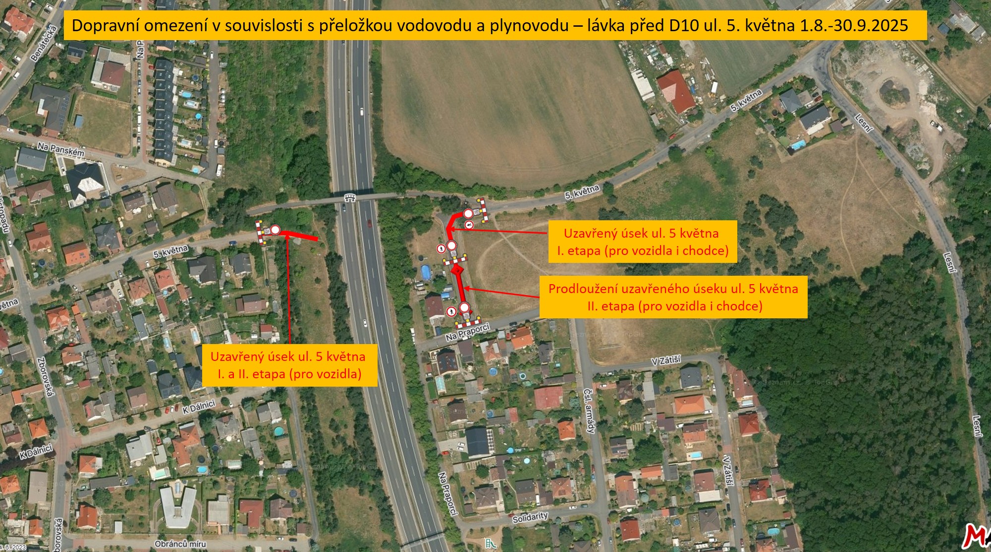Z důvodu provedení přeložky vodovodu a plynovodu bude v ul. 5. května v termínu od 1.8.2025 do 30.9.2025 (prodlouženo do 30.11.2025) v této ulici, u lávky pro pěší před dálnici D10, omezen provoz. Toto omezení bude probíhat ve dvou etapách, které ovšem nejde pevně určit.