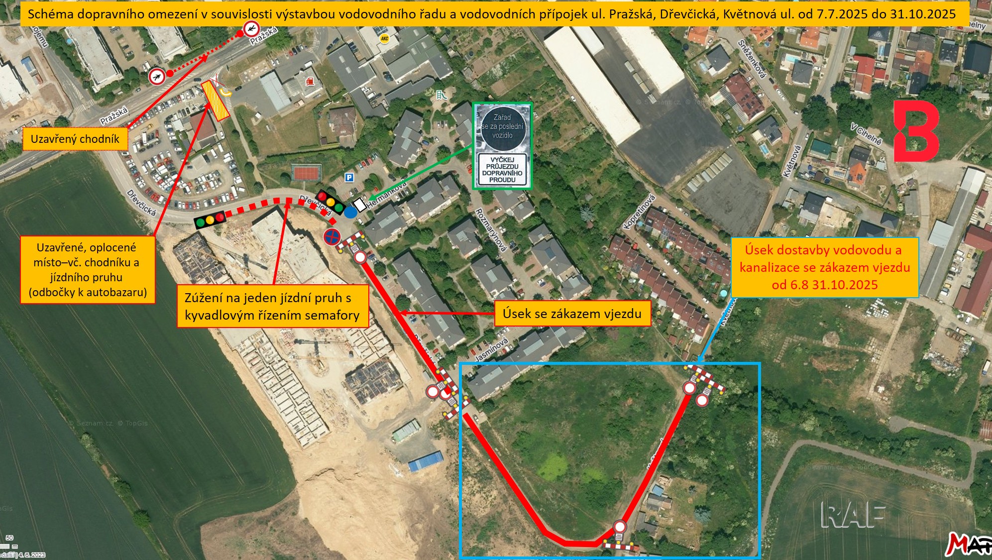 Z důvodu výstavby vodovodního řadu a vodovodních přípojek dojde ve dnech 7. 7. – 31. 10. 2025 k dopravním omezením v oblasti ulic Pražská, Dřevčická a Květnová.