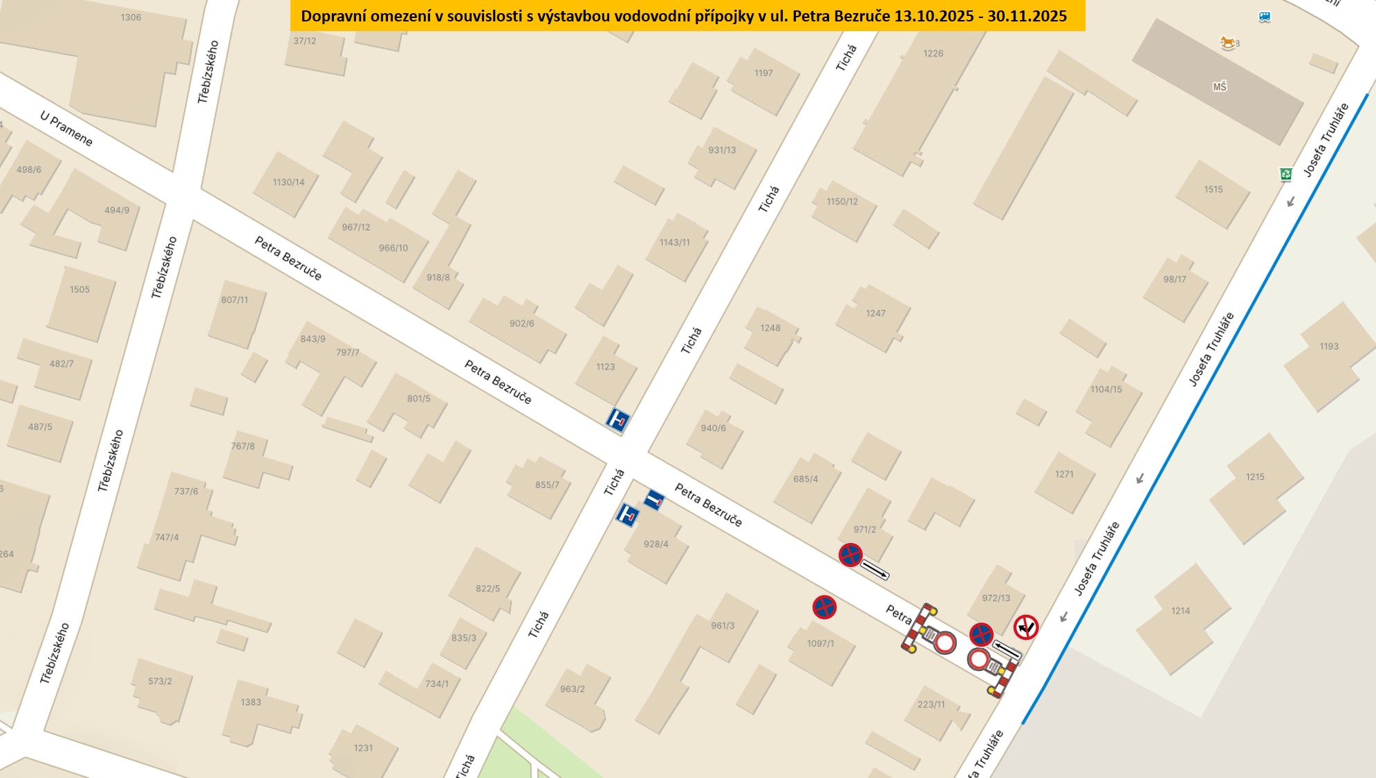 Z důvodu nutnosti provedení stavebních prací, související s realizací vodovodní přípojky pro dva RD, bude v termínu od 13.10. do 30.11.2025 omezen provoz v ul. Petra Bezruče, v boleslavské části města. Toto omezení bude spočívat v uzavření části této ulice od křižovatky s ul. Josefa Truhláře po úroveň domu č.p. 971. Také bude oboustranně zakázáno zastavení až ke křižovatce s ul. Josefa Truhláře. Bližší informace viz přiložená grafika.