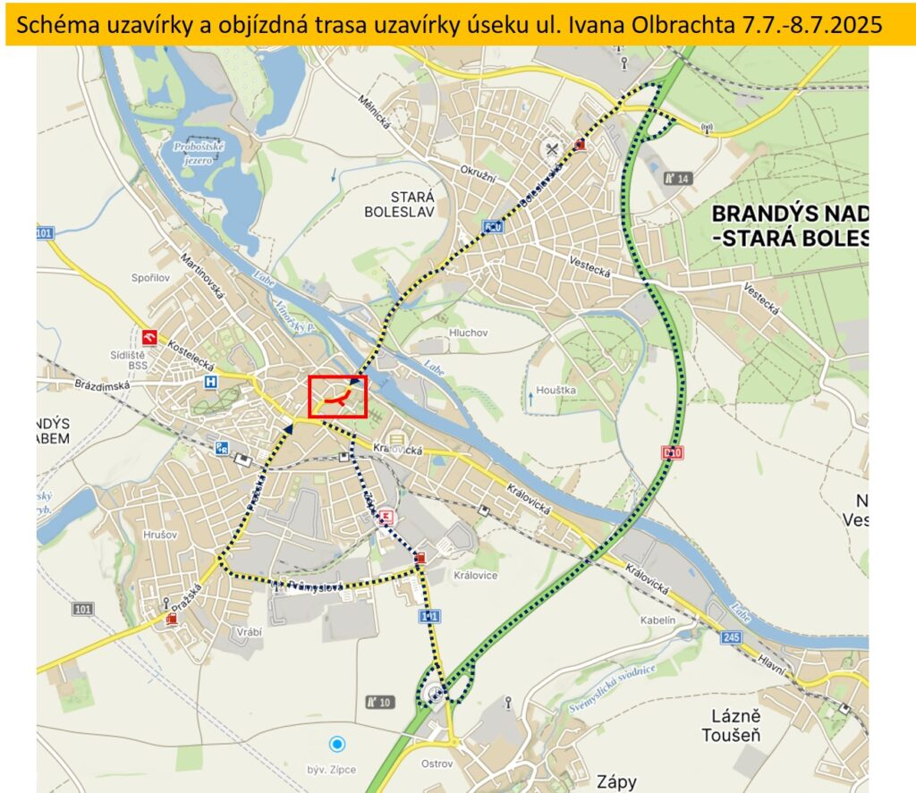 Od 7.7. do 8.7. 2025 bude z důvodu opravy povrchu vozovky zcela uzavřen úsek ulice Ivana Olbrachta, a to od křižovatky s ulicí Podkostelní po křižovatku s ulicí Pod Hrádkem – viz grafika v příloze.
