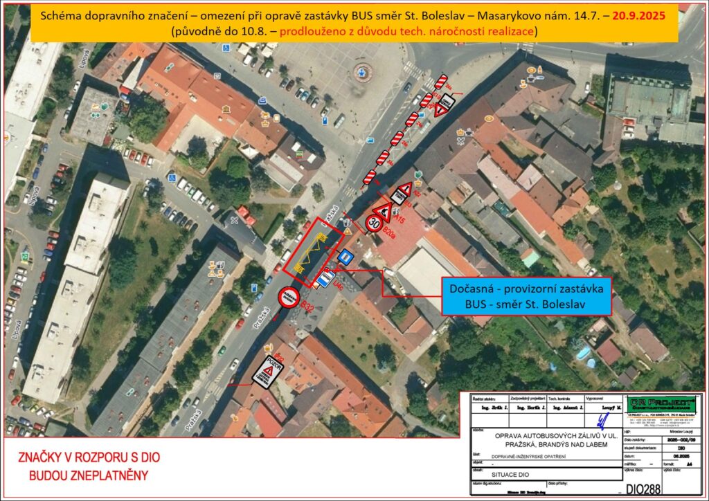 14. července do 20. září 2025 (původně do 10.8. – prodlouženo z důvodu technické náročnosti realizace zastávky ve směru na Starou Boleslav) budou na Masarykově náměstí v Brandýse nad Labem probíhat opravy autobusových zastávek.