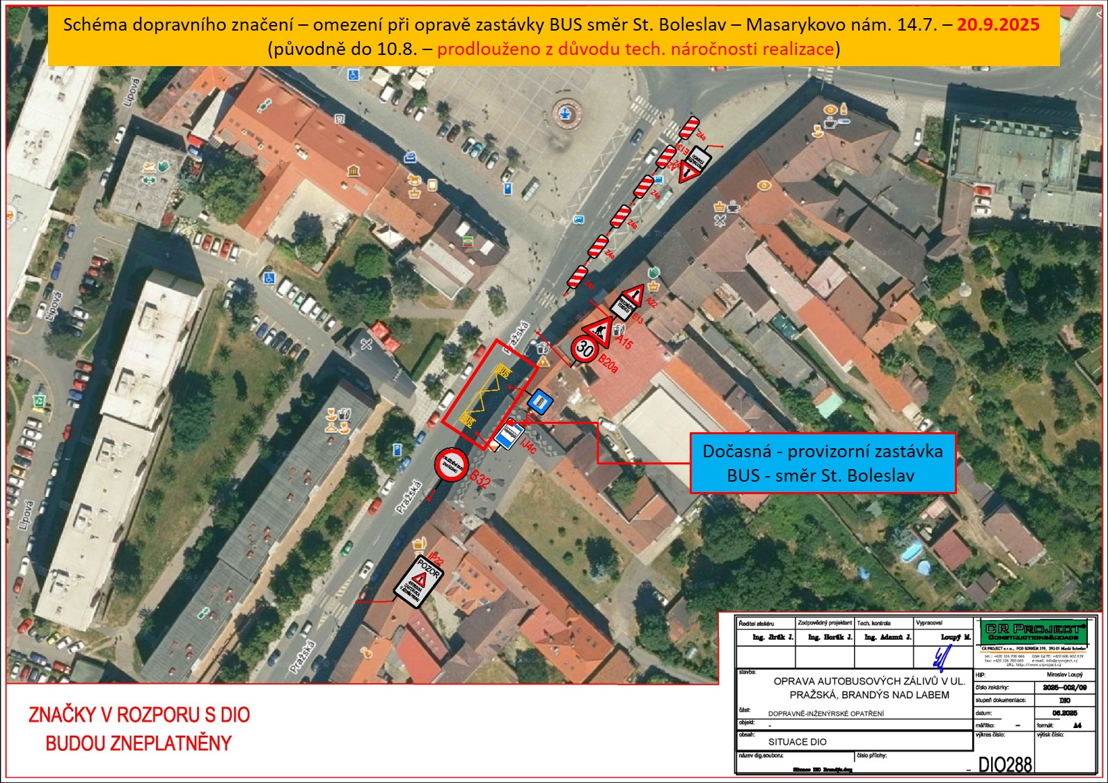 14. července do 20. září 2025 (původně do 10.8. – prodlouženo z důvodu technické náročnosti realizace zastávky ve směru na Starou Boleslav) budou na Masarykově náměstí v Brandýse nad Labem probíhat opravy autobusových zastávek.